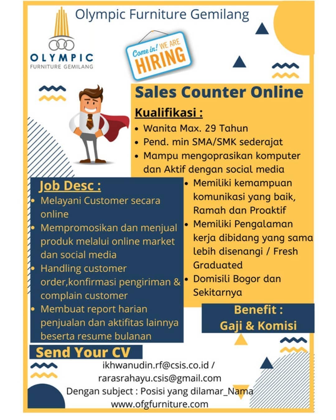 Lowongan kerja Olympic Furniture Gemilang Sebagai Sales Counter Online - Informasi Lowongan Pekerjaan Terbaru yang akan kami sampaikan pada kesempatan kali ini adalah info loker yang berasal dari berbagai sumber terpercaya yang diperuntukan untuk anda lowongan kerja swasta yang ada di Indonesia. Tidak ketinggalan juga lowongan kerja BUMN dan lowongan kerja Bank. Tentunya hal tersebut disesuaikan dengan latar belakang tingkat pendidikan anda dari lulusan SMA/SMK/D/S1.